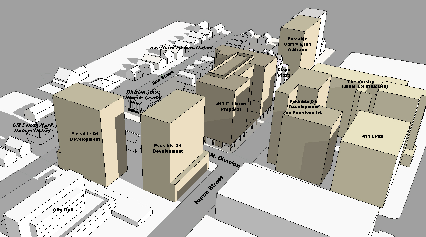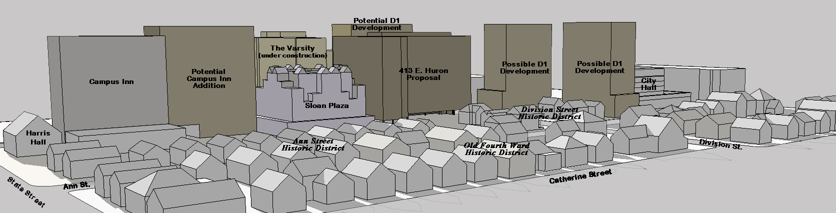 Here are SketchUp illustrations showing how the D1 zoned area along East Huron Street could be built out, based on provisions of the current zoning ordinance. The masses are approximate, but generally fit within the parameters of 700 percent Floor Area Ratio; 900 percent could be used if affordable housing was included. (Scroll your screen to see the full illustration.)Return to Huron Street Issues page.