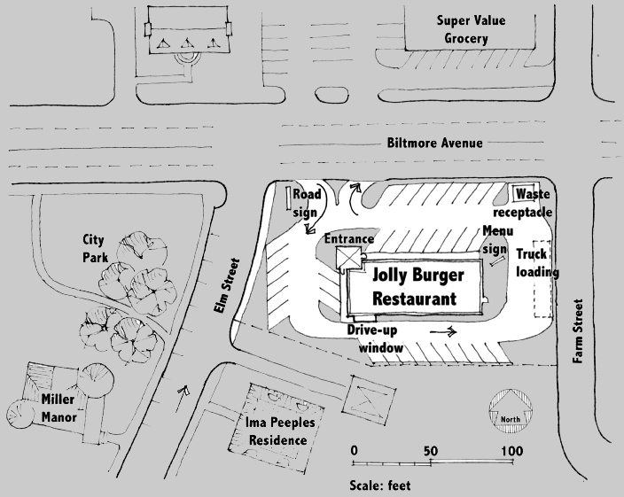 Issue: Jolly Burger Proposal A site plan has been submitted to the city of Rivertown for construction of a fast-food drive-through restaurant with limited indoor seating on a vacant site on Biltmore Boulevard. The proposal includes a building, 80 by 35 feet, designed to have up to eight employees working at one time.  Jolly Burger Site Plan ProposalYour assignment as community planner is to review the Jolly Burger preliminary proposal. List items that do not meet the zoning ordinance. Also identify design features that represent poor planning practice in general, whether or not part of the zoning ordinance. Special attention should be paid to the project's impact on adjacent properties, especially the home of Ima Peeples, who lives just south of the site and who is president of the group, Concerned Citizens of Rivertown. You should review the Rivertown Zoning Ordinance. Also refer to a Topic Web Page on site plan approvals. |