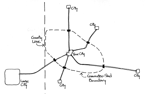 Techniques for determining commuter-shed:a. If you can, draw the commuter-shed boundaries based on information gathered from local employers.b. An alternative technique is simply to locate on commuter roads emanating from your community a spot midway between your city and the next larger city on that road. Connect these marks in a more-or-less circular pattern around your city to form its commuter-shed. (Note: If the next city along a road is much larger, the mark should be closer to your city, since the large city will generally draw from a further distance.)