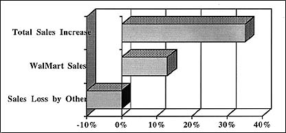 As WalMart Executive Vice President Nick White stated, "We believe that the opportunities are fantastic and endless."2 As successful as the company has been with their 80,000 to 120,000 sq. ft. marts, they are now upping the ante with the construction of new SuperCenters. These stores will include a full-service grocery store, a tactic which Meijers introduced many years ago in Michigan, and which is now catching on with the other large discounters. As White says, "We think we'll be able to grow this particular operation into the future indefinitely. The biggest challenge we have is our own ability to move as quickly as we would like to. Thus far, we have been able to more than double our supercenters each year over the past four years."3