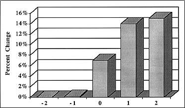 A study by Gruidl and Kline (1992) of Illinois towns indicated that the infusion of a large discounter store in a community dramatically increased the retail market area and draw for that particular town. As shown in the graph below, there was minimal growth in the two years preceding the opening of WalMart stores, but the years following show increases of 14 to 15 percent almost immediately. It may be assumed that WalMart's market analysts consciously looked for sites where there was already economic growth, but it is more likely that locating a new WalMart store in a community generated the resulting economic growth.