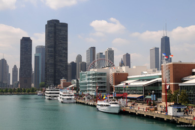 Navy Pier is on the lakefront property of Lake Michigan. It combines the shipping business with recreational and entertainment activities. It encompasses more than 50 acres of parks, gardens, shops, restaurants and other entertainment. The Navy Pier contains 170,000 total square feet of exhibition space, 50,000 square feet of reception space and 48,000 square feet of meeting room space. Several business conventions, art shows, and public festivals occur at the pier annually. Families can enjoy the Childrens Museum, the Skyline Stage outdoor theater, Crystal Garden indoor park, as well as an IMAX theater all located at the pier.